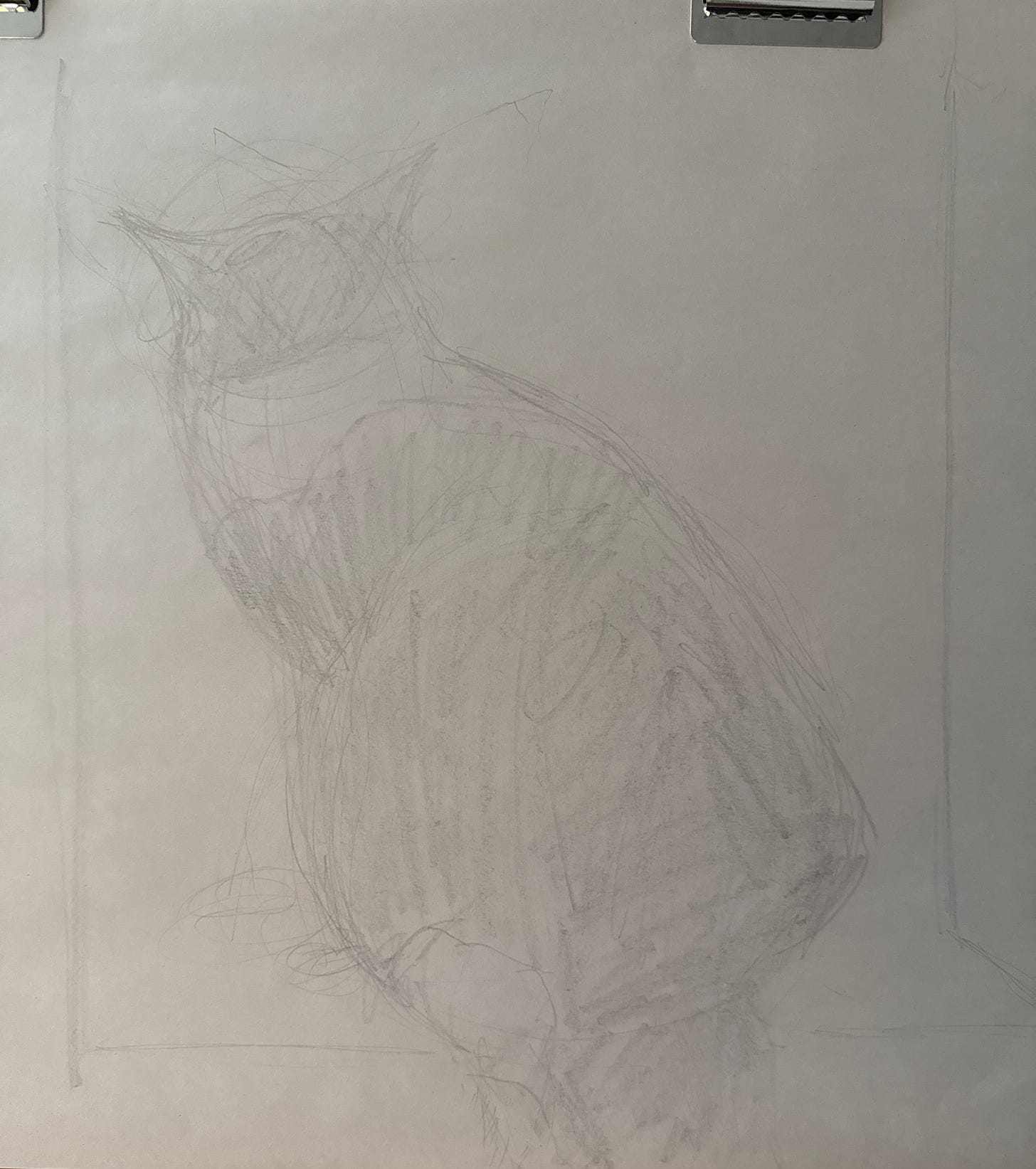 Another example is this large-format sketch. Recently one of my cats was sitting in the window behind my large easel, when I was in a process of shutting down the studio for the day. I figured I would just wait for her to jump down since she’s never up there long. She’s an energetic and curious young cat, and never hangs out anywhere long unless she falls asleep there. It happened that I’d already set up a blank sheet of large newsprint on the drawing board, so I grabbed a soft pencil and started sketching. She could only have been in the window for ten minutes, and I was able to make a complete light sketch of her form in that time. I may try and make a real drawing based on this sketch.