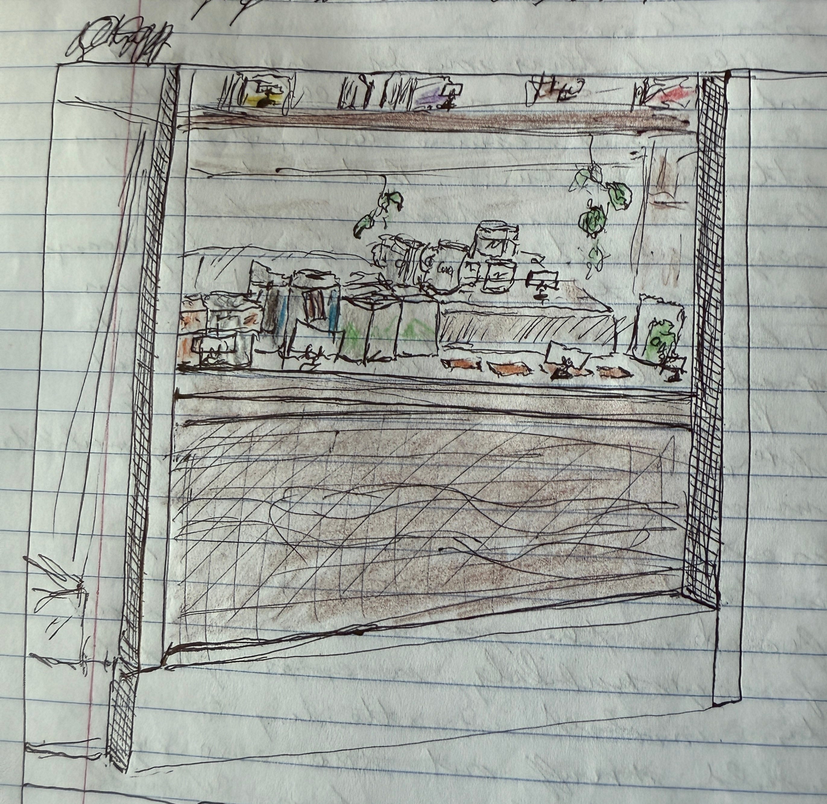 If you keep things basic, making art and writing are two of the least-expensive pastimes. They can also be two of the most time-consuming. That’s not a bad thing. But until recently I tended to overestimate the time I’d need, and so I’d put off doing a sketch because I was afraid of looking up and finding an hour had gone by and I’d missed an appointment. But then I do it, and even a more-involved sketch, like this one of the merch display at my corner coffeeshop, turns out to have taken only a quarter of an hour.